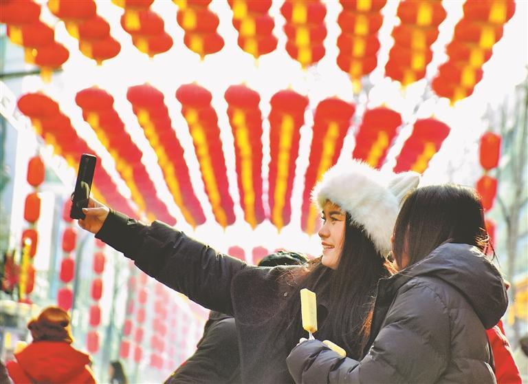 2月10日,北方小年,为迎接新春佳节的到来,哈尔滨市道外区南三道街悬挂了近千盏红灯笼,喜庆气氛浓厚。在一排排大红灯笼下面,有的游客在拍照,有的游客在观赏风景。