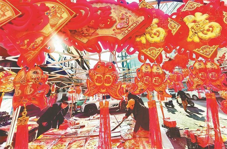 13日,哈尔滨市道外区大水晶街附近的集市上,许多市民在购买年货。集市上,各种商品琳琅满目,应有尽有。红灯笼、“福”字、对联烘托出浓浓的喜庆气氛。人们脸上都洋溢着幸福的笑容,个个满载而归。