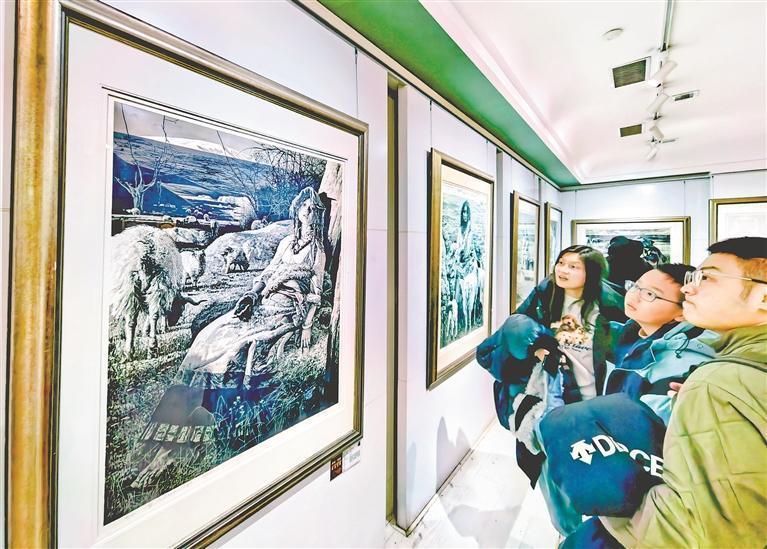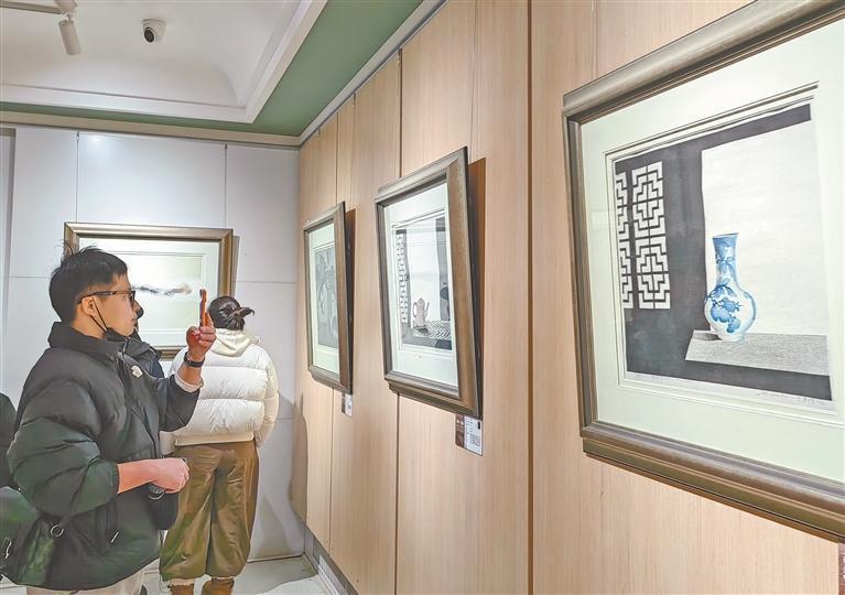 近日,位于哈尔滨市道外区的哈药六版画博物馆内,游客们在展厅里观赏油画、版画,在走廊和大厅里打卡拍照发朋友圈。