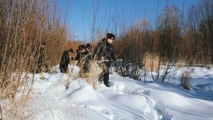 2月15日,漠河市公安局西林吉镇派出所民警辅警入山踏查。张雪婷摄