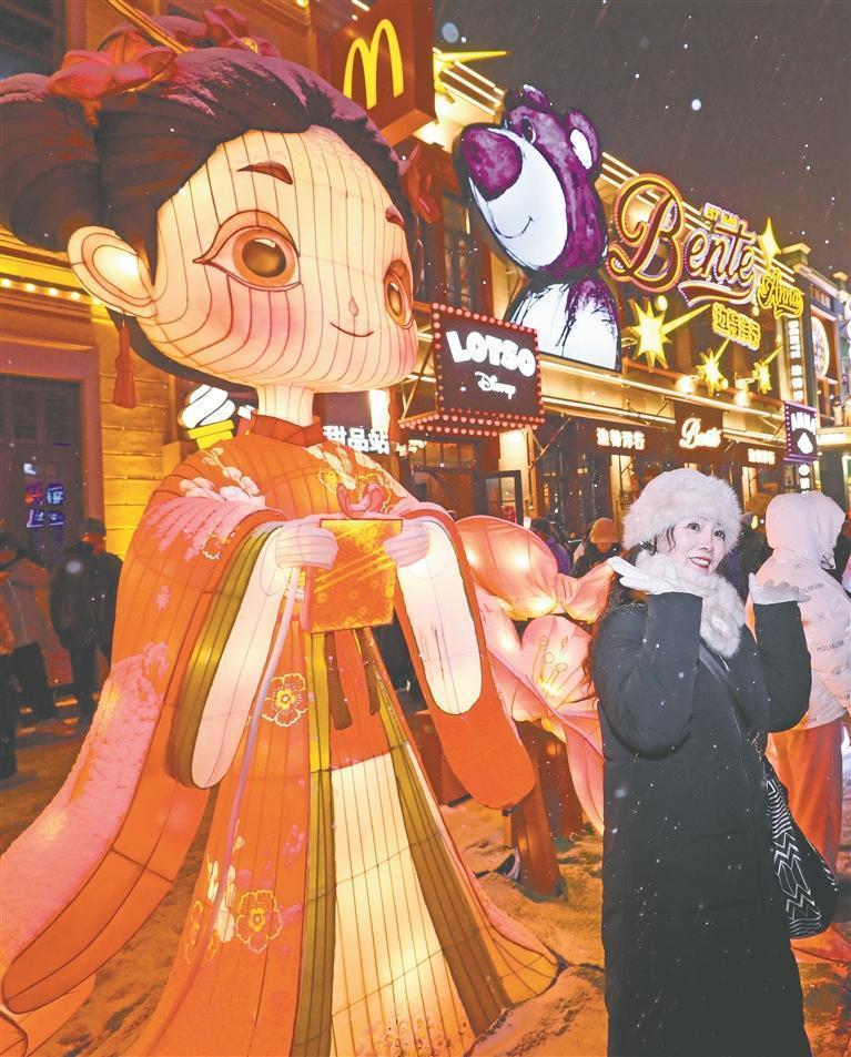 当日,鹅毛大雪悄然洒落,覆盖中央大街、松花江畔、中华巴洛克历史文化街区等景区的各式花灯。红灯笼覆上薄雪,愈显艳丽;冰雕彩灯与雪相映,光影梦幻,将雪的清冽与灯的暖辉完美融合,整座城市宛如一幅雪景灯画。