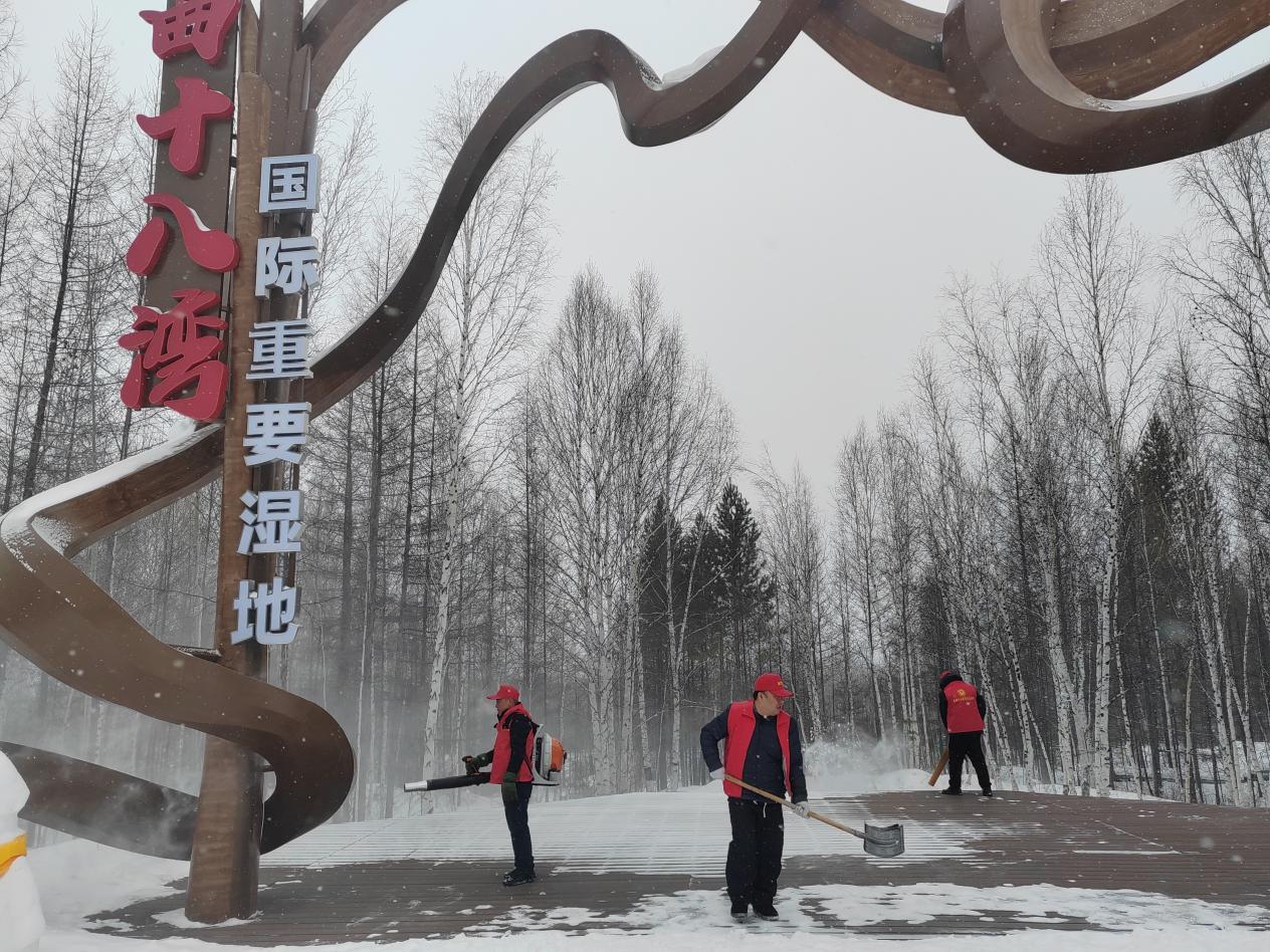 扮靓林海家园,守护平安出行。志愿者们走上街头,手持雪铲、垃圾夹、垃圾袋等工具,对辖区道路两侧、公共区域开展集中清洁,重点清理积雪残冰、白色垃圾及公共设施小广告,以实际行动倡导绿色低碳生活方式,引导群众养成文明卫生习惯,共同守护整洁优美的人居环境。针对景区积雪积冰问题,志愿者们分工协作、铲冰除雪,清理步道、观景台等重点区域,及时消除安全隐患,全力保障游客和群众出行安全。严寒中忙碌的身影,成为春日里最动人的风景,以实干彰显奉献本色,用坚守传递雷锋温度。