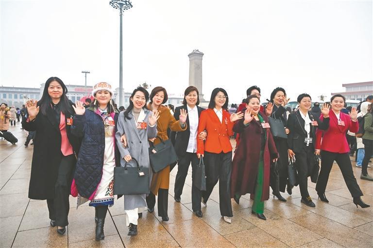 全国两会期间,参加十四届全国人大四次会议的黑龙江女代表意气风发步入会场。