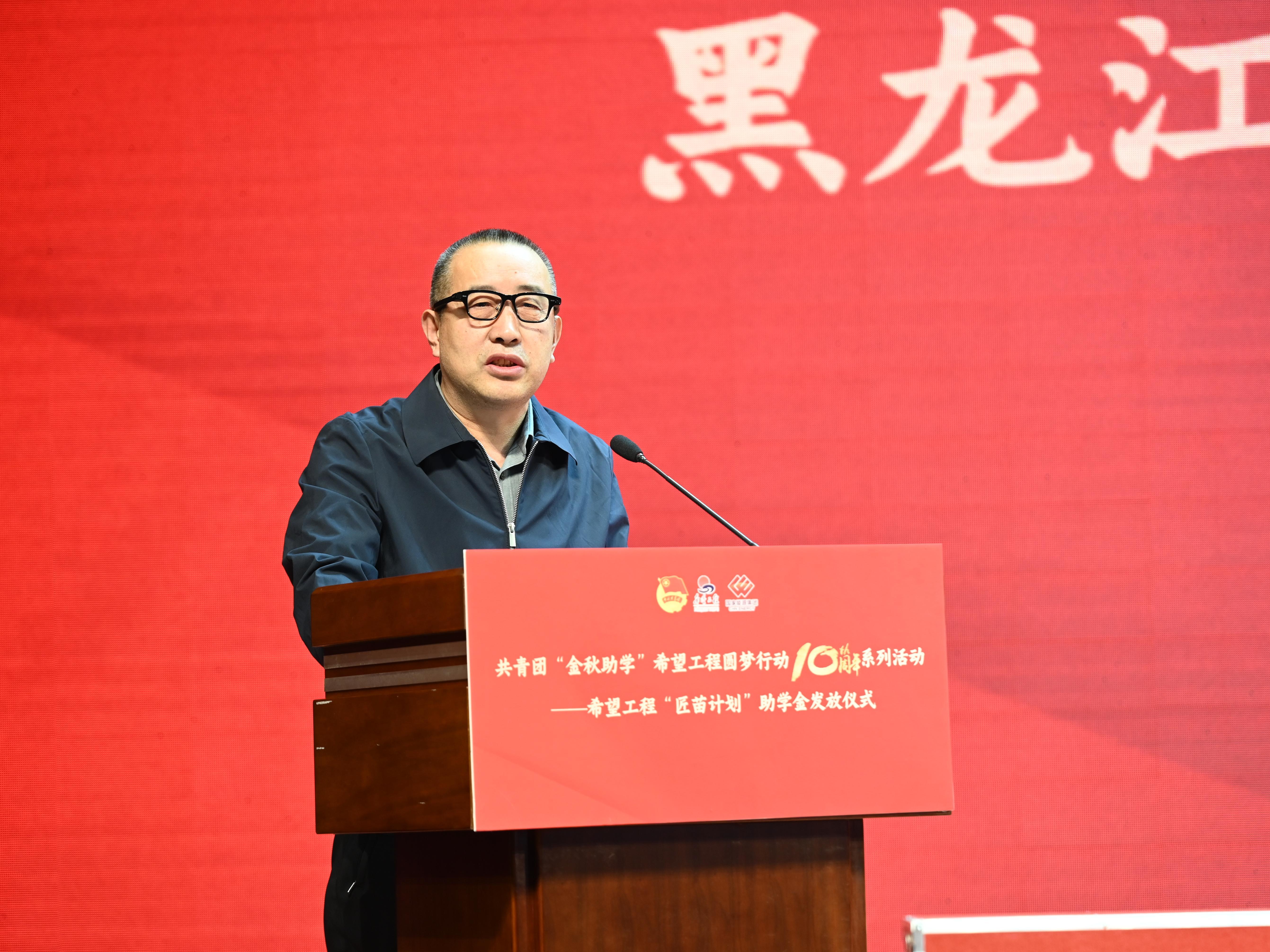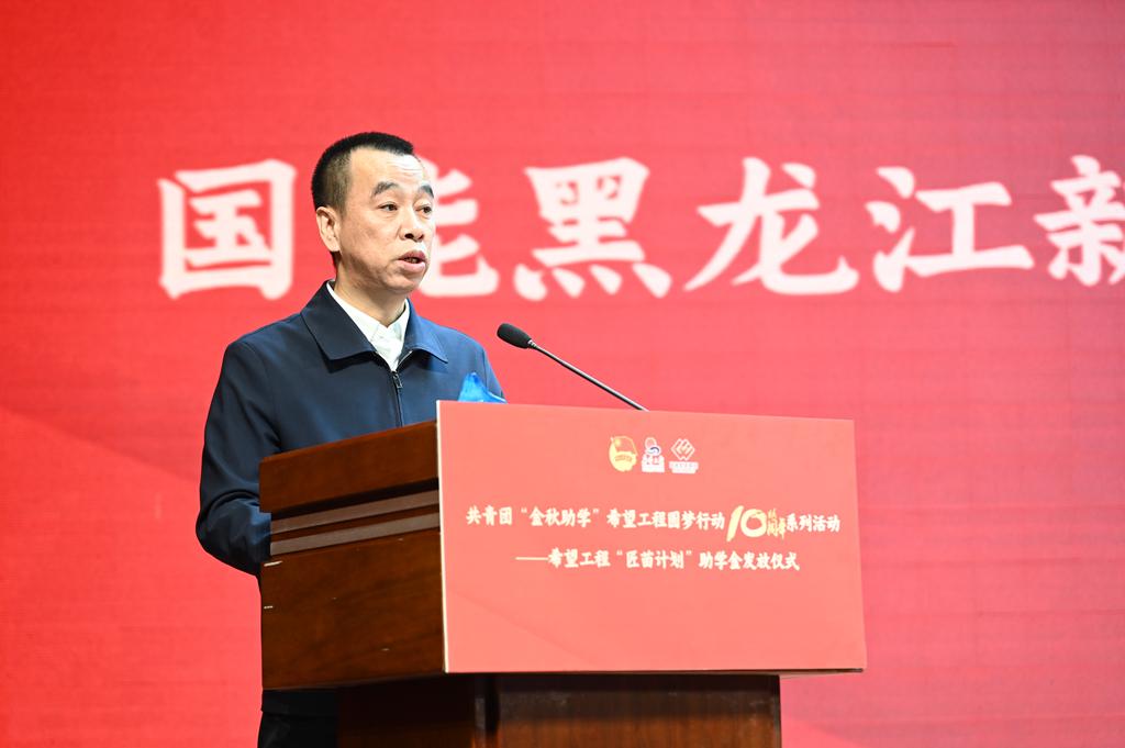 国能黑龙江新能源有限公司党委书记、执行董事迟凤亮发言。他表示:“履行央企社会责任、传递社会温暖是企业的初心与担当,未来,国能黑龙江新能源有限公司将继续践行央企责任,一如既往地支持希望工程事业,关注青年成长,与社会各界一道,共同为龙江全面振兴全方位振兴贡献力量。”
