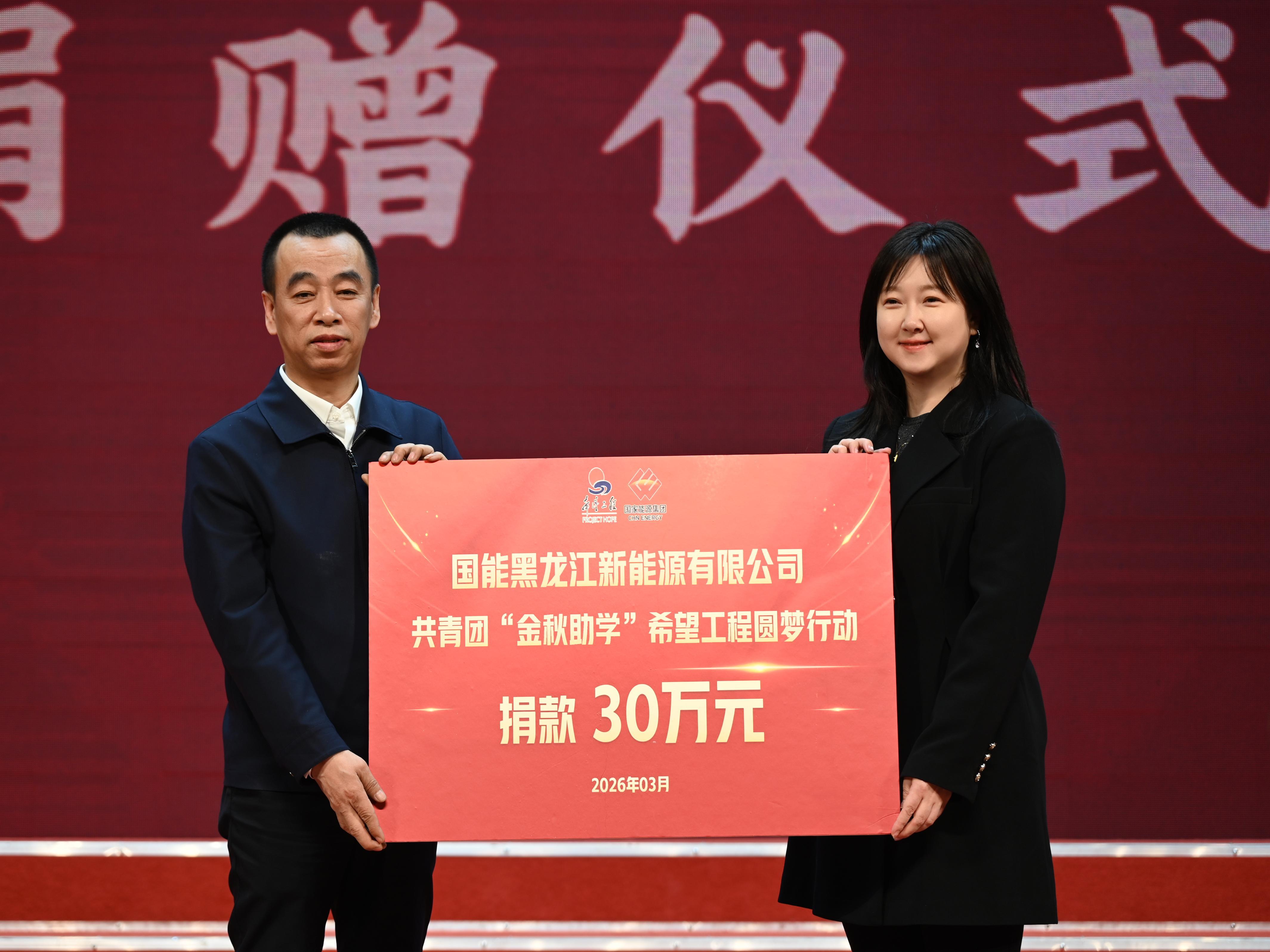 在捐赠仪式上,国能黑龙江新能源有限公司向省青基会捐赠共青团“金秋助学”希望工程圆梦行动助学金30万元。其中,20万元将专项用于资助全省13个市地、23所技工院校中品学兼优、家庭经济困难的100名学生,为困境学子纾困解难,助力他们顺利完成学业、掌握一技之长,凭借技能实现人生价值、圆人生梦想。