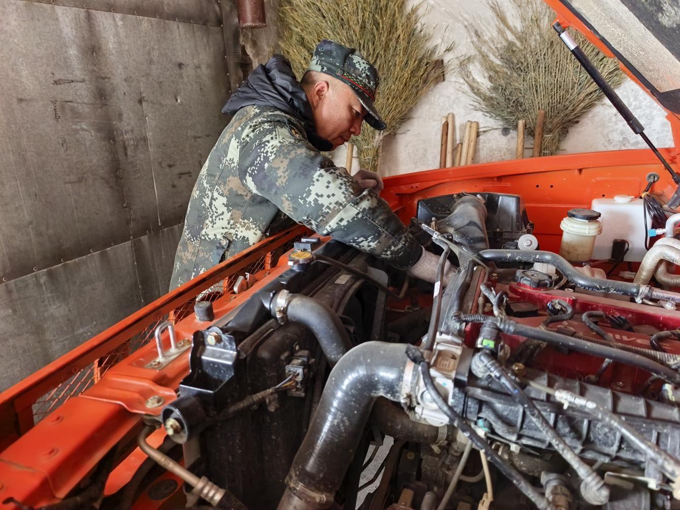 林场技术人员正在检修维护防火车辆(柏松 摄)