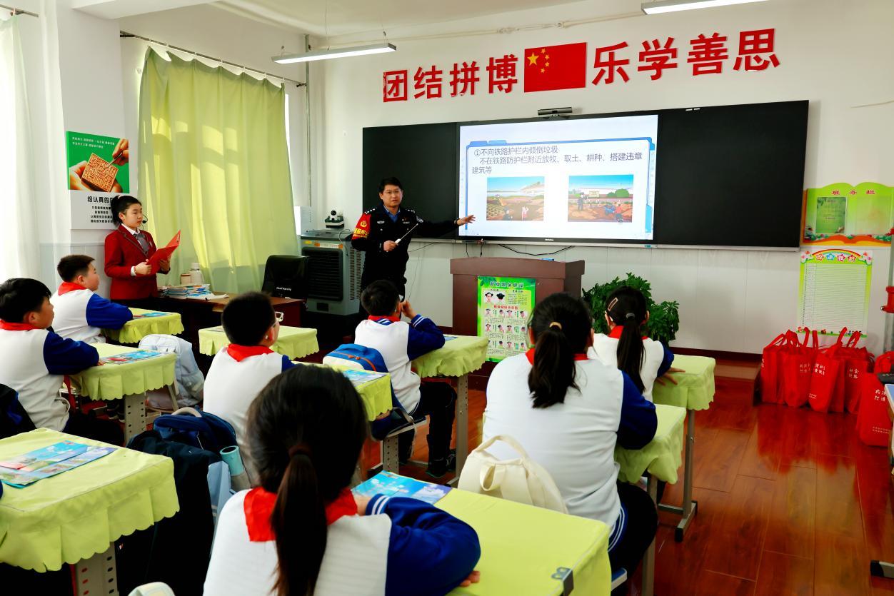 漠河站铁路派出所的干警在向小学五年级学生讲解铁路安全注意事项(王力 摄)