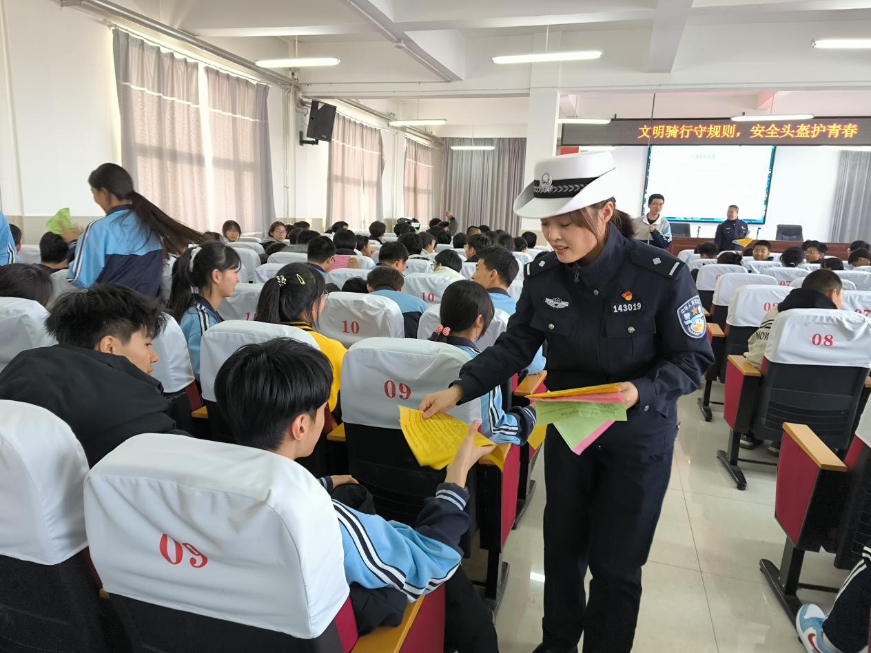 考虑到高中生群体的特点,且部分学生上下学有骑行电动自行车的需求,在宣讲现场,民警用通俗易懂的语言、贴近校园周边的案例,围绕电动自行车驾乘安全这一核心,展开交通安全知识讲解。并通过播放典型事故案例视频,以案说法,直观展示了未佩戴头盔在发生碰撞时头部遭受致命伤害的惨痛后果,以及多人合乘一辆车、追逐打闹等行为带来的失控风险。活动现场还设置了互动问答环节,同学们踊跃参与,在轻松氛围中巩固了“知危险、会避险”的交通安全知识。