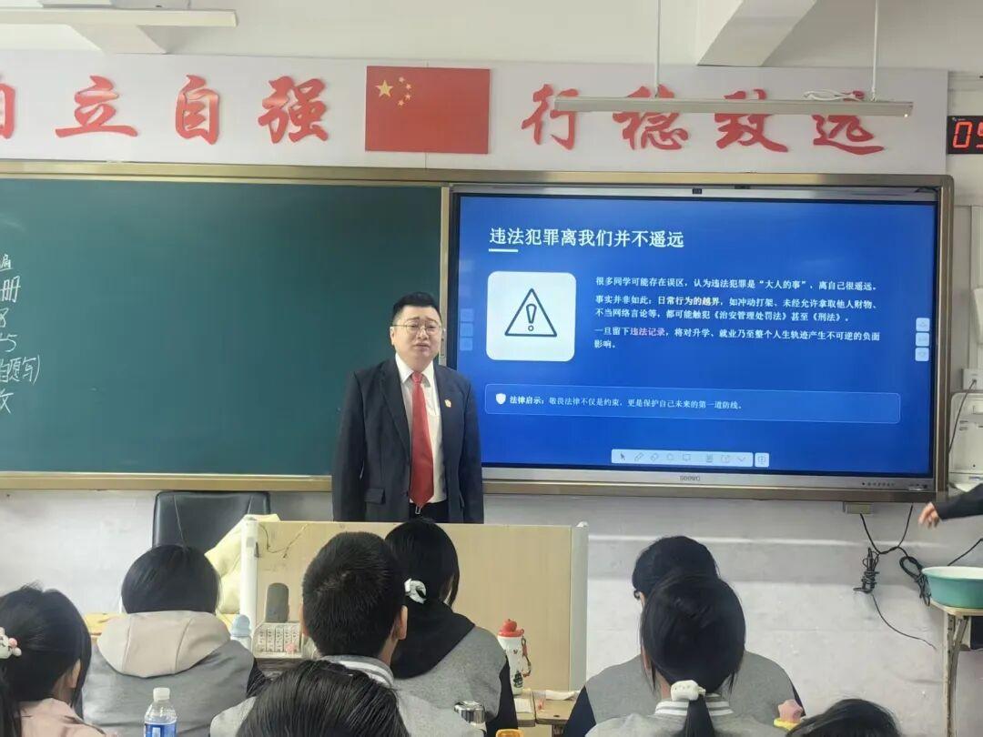 深入班级,互动答疑解惑。集中宣讲结束后,赵世奇走进各班级,开展小范围、针对性更强的法治辅导。根据不同班级学生的年龄特点以及日常相处中暴露出的微小矛盾、行为偏差,进行“点对点”法律指导。在班级课堂上与学生近距离围坐交流,耐心解答学生提出的法律疑问,并结合班级实际发生的典型小事,将法律知识细化到学习生活的具体场景中。这种面对面、心贴心的互动方式,让法治教育更加鲜活、可感,真正实现了普法宣传全覆盖、无死角。