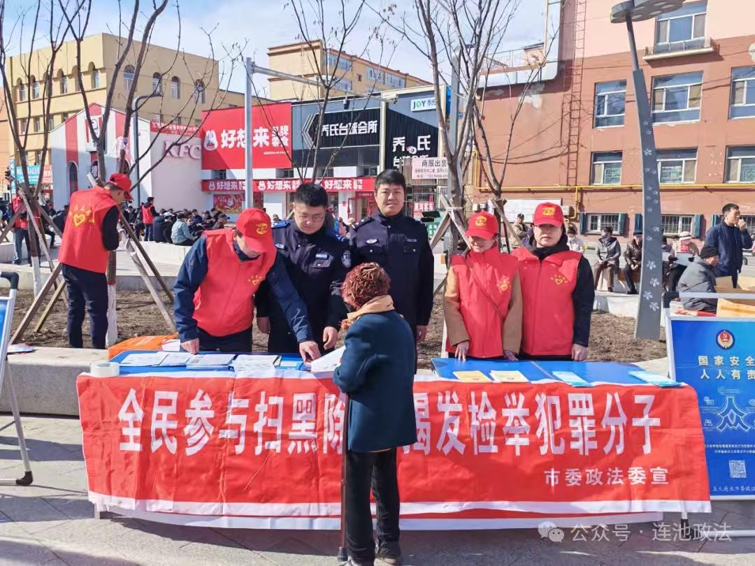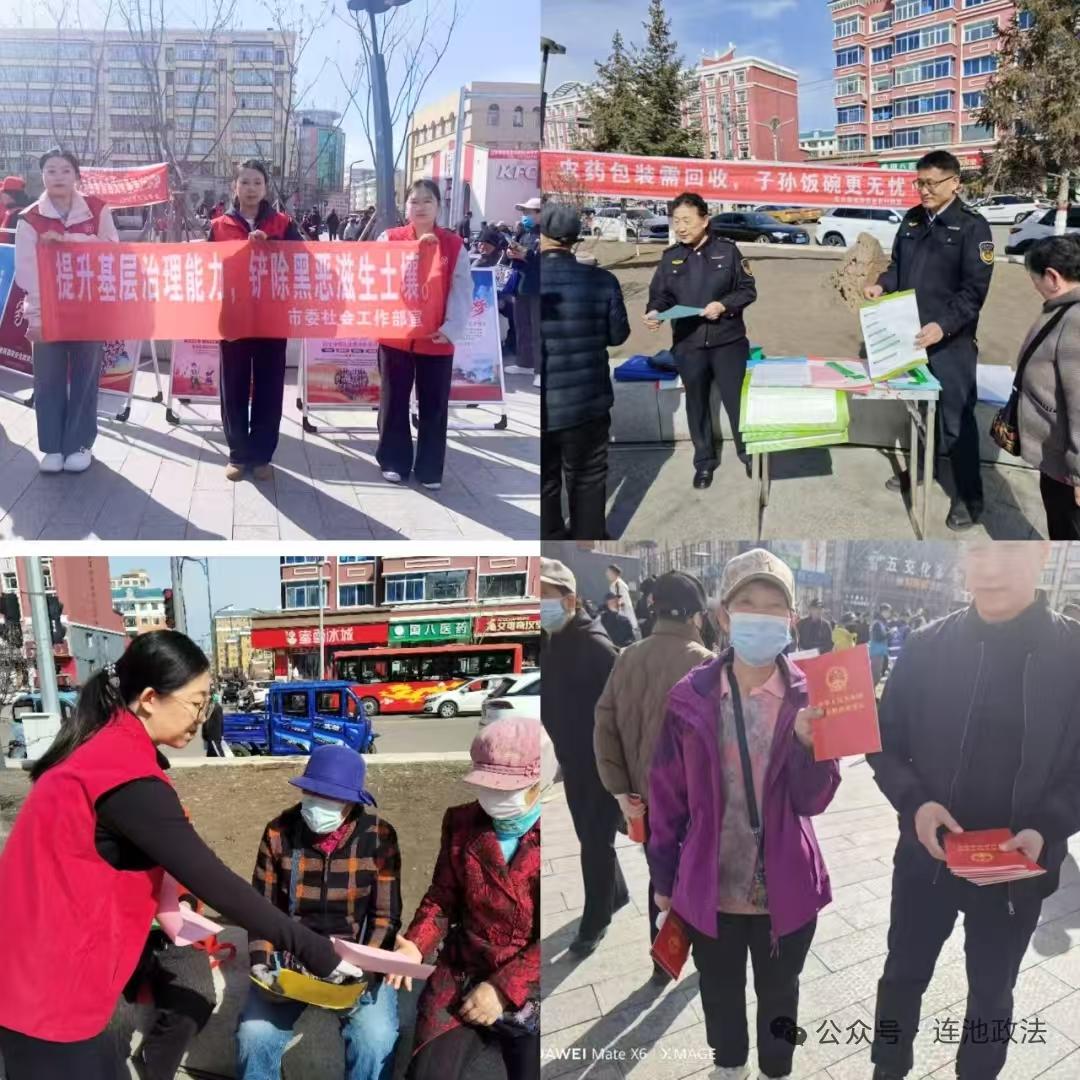 突出重点强化集中宣传。4月15日,五大连池市委政法委组织市公安局、市司法局、市农业农村局、市委社会工作部等单位在市双拥广场开展集中宣传活动,通过摆放宣传展板、悬挂宣传横幅、发放宣传资料、设立法律咨询台等多种形式,向广大群众普及国家安全和扫黑除恶有关法律法规知识。活动中工作人员重点讲解扫黑除恶的重要意义、涉黑涉恶线索的举报方式等内容,并结合典型案例生动直观地向群众展示黑恶势力的社会危害性和法律后果,进一步提升宣传活动的针对性和实效性。同时,针对群众提出的各类法律咨询,现场进行耐心解答,精准回应群众在法律适用、权益维护等方面的疑问,切实为群众排忧解难。